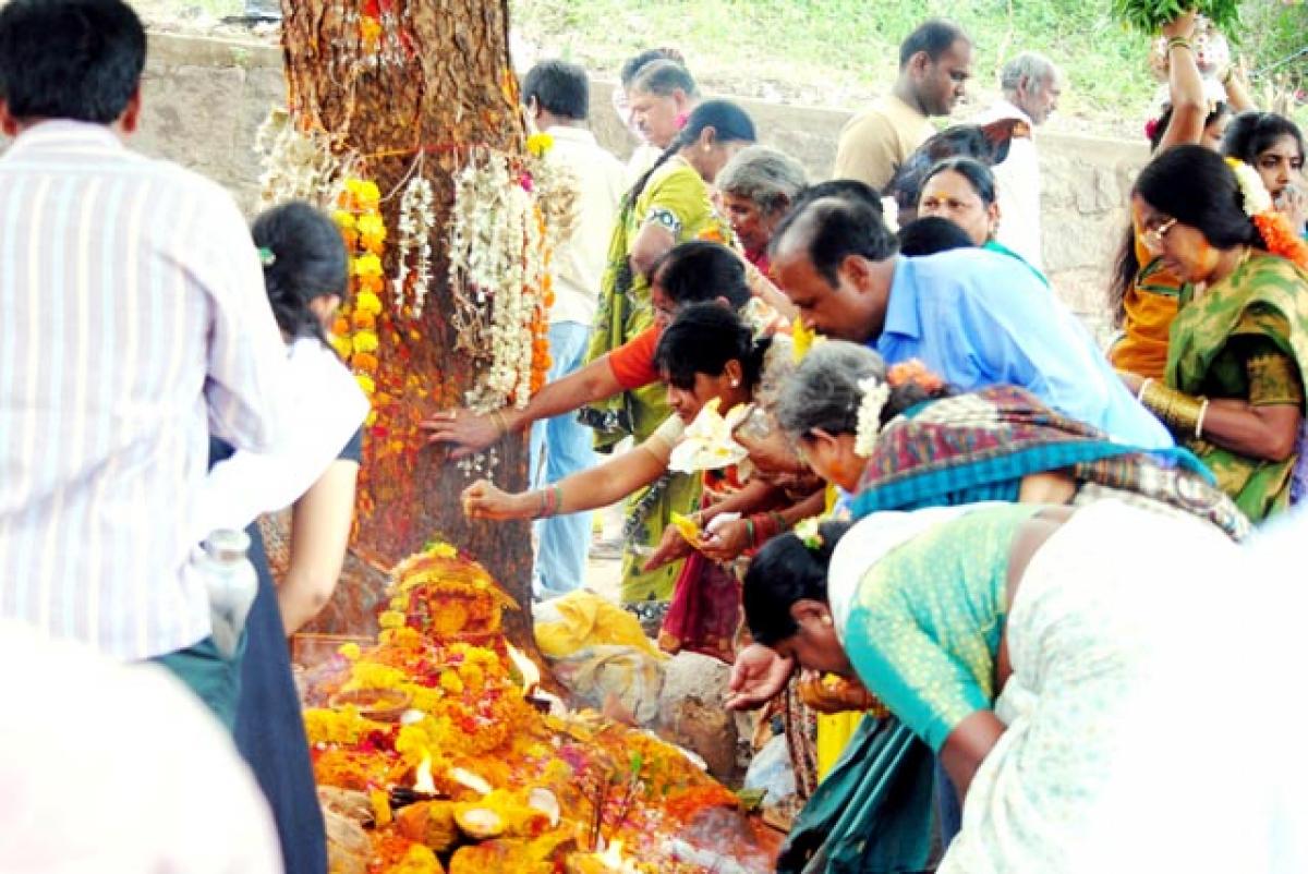 Spread over a month, each of the Sundays, Bonalu has a special venue. Pothuraju, the brother of Mother Goddess is represented in the pageant by a well-built, bare-bodied man, wearing a small firmly draped red dothi and bells on his ankles, and anointed with turmeric on his body and vermilion on his forehead who dances to resounding drums holding a rope.