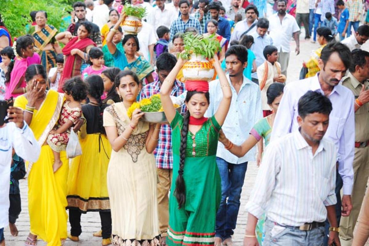Women prepare cooked rice with milk, jaggery in a new brass and earthen pot decorated with neem leaves, tumeric, vermilion and decorate the top of the pot with diyas. Then they carry these pots on their head and make offering of Bonam and take three pradakshanas. The procession of these women is often led by dancing men, performers, artistes and drummers.