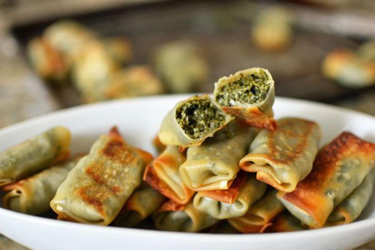 Blanch spinach leaves in hot water for a minute. Remove from water. Now take a leaf, put a spoon full of mix at the edge, roll it nicely till the end.