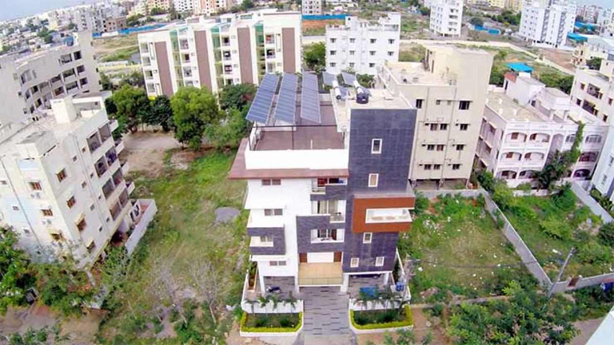 India’s first solar powered apartment has been developed by start up construction company Supra Builders Pvt. Ltd in Kondapur. The 400 square yards apartment has been christened Pride Supra Homes and all houses have been sold. “The 12KW solar rooftop installation is the primary source of electricity to eight flats, illuminating 200 lights, 40 fans, 8 TVs and computers,” informed a software professional-cum-real estate builder,