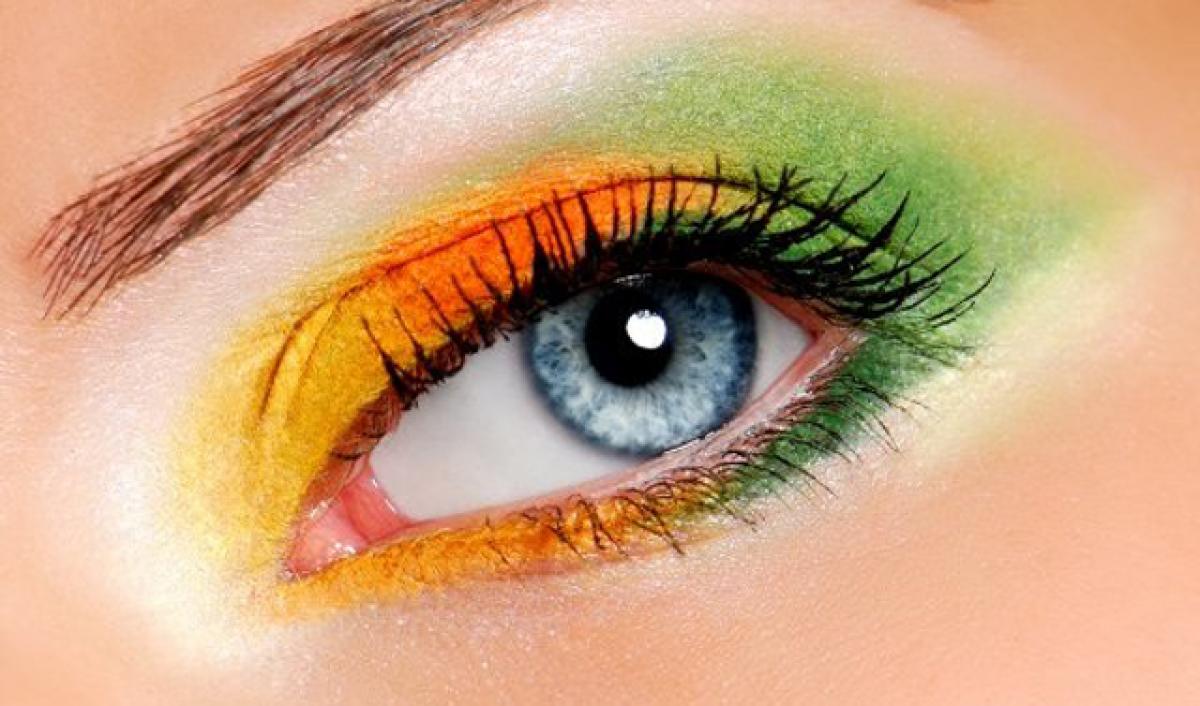 - Add orange to the eye lid, perfectly blending with the edges of green eye shadow.