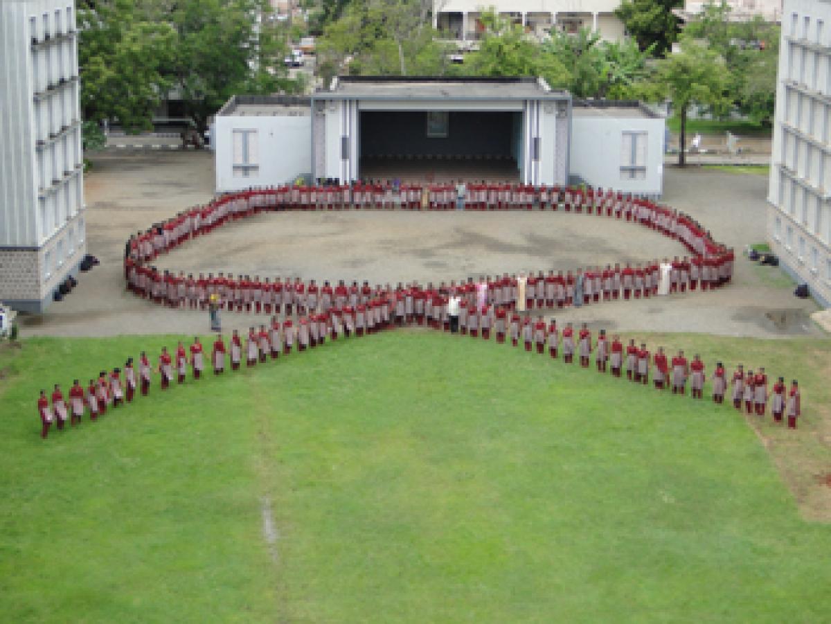 Students formed the Red Ribbon logo to promote awareness among people about HIV/AIDS. Later, they took the International Youth Day pledge.