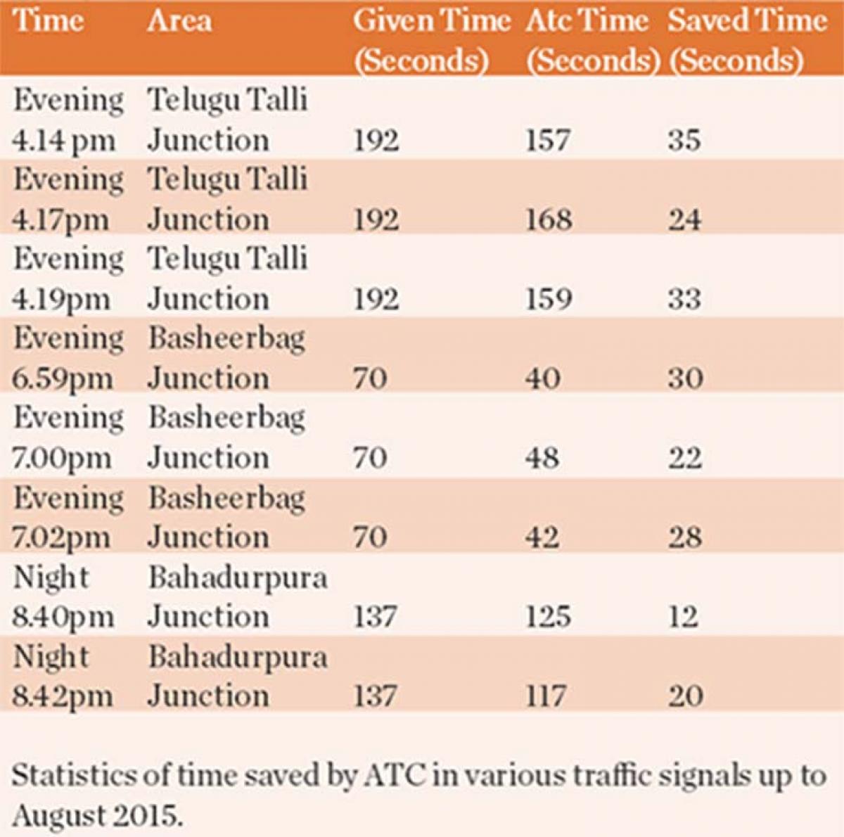 The system began its first run on August 6 and has reported to have saved upto 35 seconds at various signals. Inspectors and SIs of twenty-five traffic police stations are being trained in the workings of the ATC system, which is currently available in 120 traffic junctions under the control of the Hyderabad Commissionerate. With the ongoing Metro works, junctions in Kukatpally, LB Nagar, Secunderabad and Begampet are not using this system.