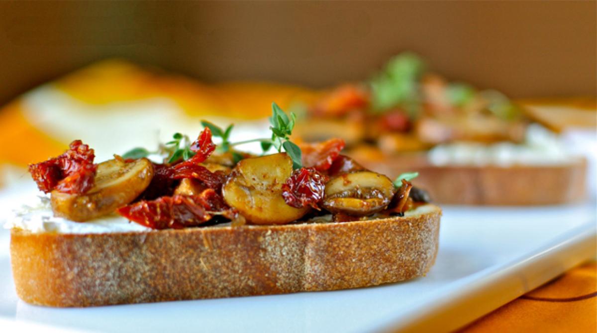 - Spread the mushroom-tomato mixture on 4 slices of toasted bread.