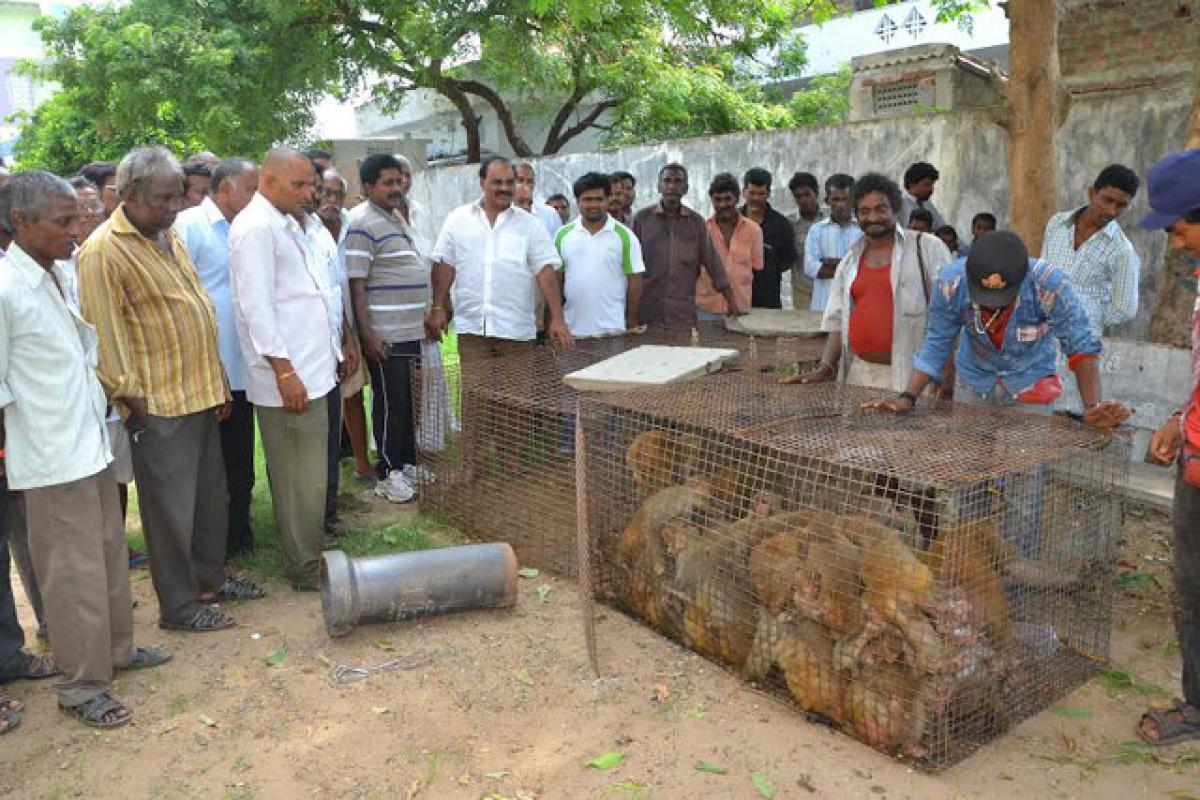 In Gorantla the local people say that the menace has been there for more than a decade. Civic staff set traps all over the places and caught nearly 50 monkeys. The monkeys were being sent to the Srisailam forest area with the help of the forest department.