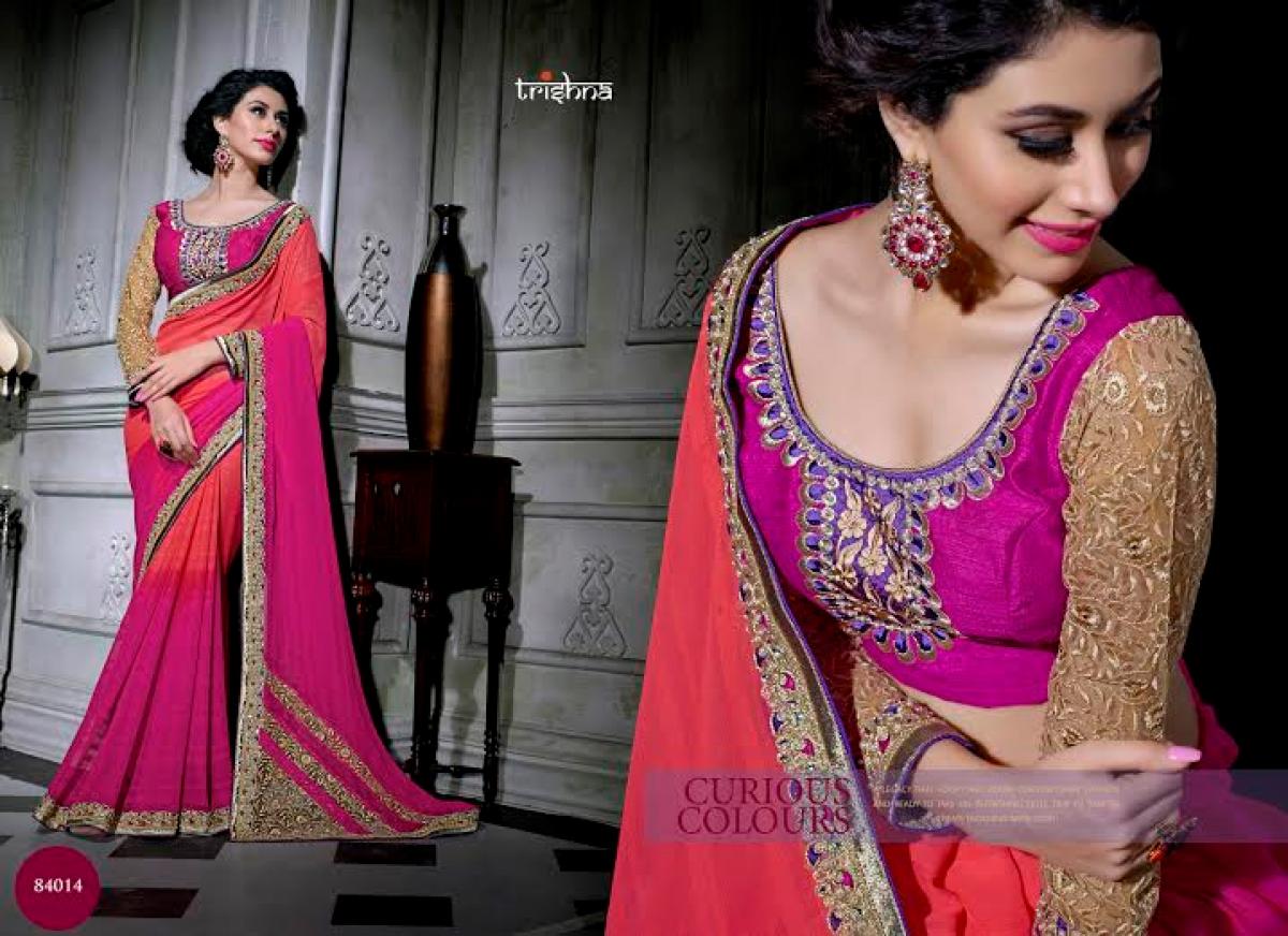 Cut work, stone work and embroidery are combined to beautify the sarees. Sparkle, sequence work, foil work are used in velvet blouse fabrics. The sarees have a two tone effect. Fancy jacquard, chiffon, georgette based fabrics are used in sarees. With the use of contrasting colors and beautiful border work combined with fashionable blouse pieces; this can be a dream collection to own for every woman.