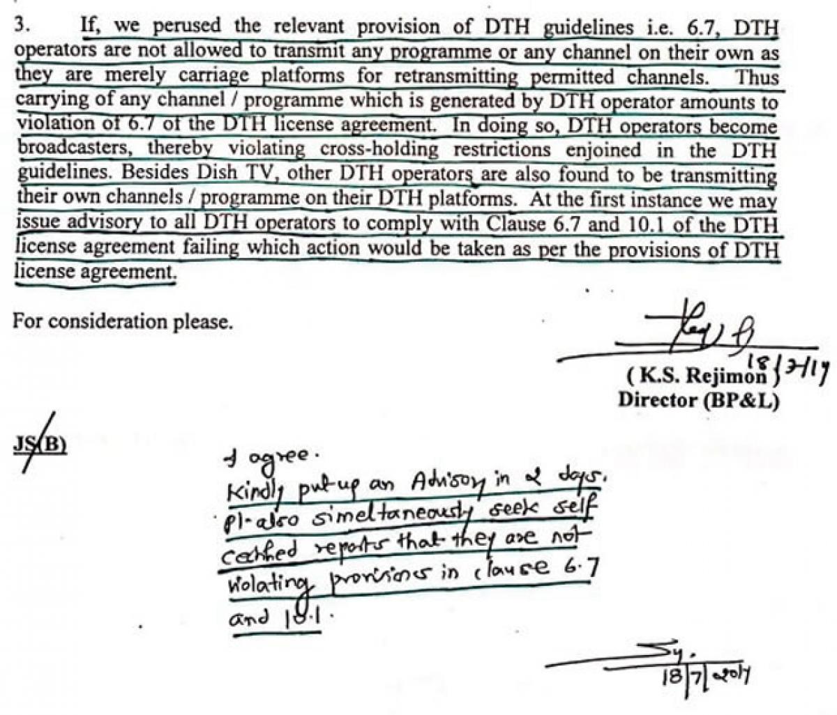 Ministry of I&B acknowledges violations: Copies of file notings recently obtained under RTI Act revealed that Ministry of Information and Broadcasting did conclude in unambiguous terms that the DTH companies are in clear breach of clauses 6.7 and 10.1 of DTH guidelines by broadcasting their own channels.