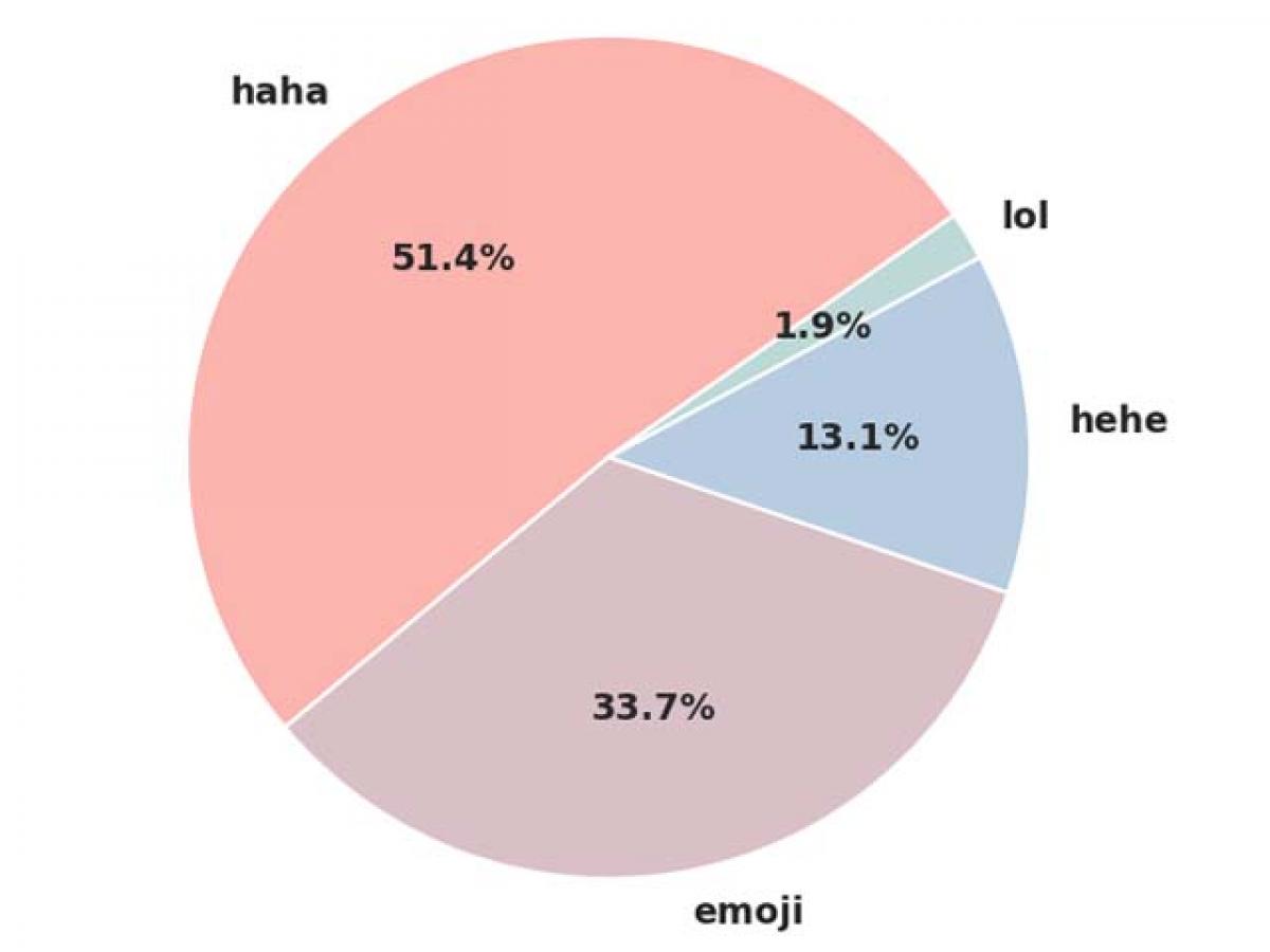 It was found that the most common e-laugh was ‘haha’ followed by various emojis denoting laughter and ‘hehe’. Young people and women prefer emoji while men prefer longer ‘hehes’. Across genders, both men and women used more of ‘haha’ and ‘emoji’, followed by ‘hehe’ and ‘lol’.