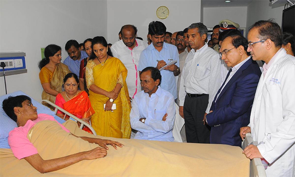 Hyderabad: Moved by the plight of Pratyusha, the girl who was tortured by her father and step-mother and now undergoing treatment at a corporate hospital, Telangana Chief Minister K Chandrasekhar Rao along with his wife Shobha Rani, and daughter K Kavitha, visited Prath- yusha on Saturday.