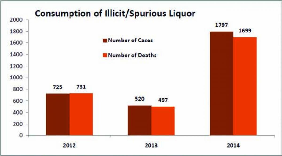The tax revenue from liquor is rising by the year while the number of incidents of consumption of spurious liquor is also growing by the year. Close to 3000 people lost their lives during 2012-2014 because of the consumption of spurious liquor, according to a report in Factly, a website that boasts of ‘Making Public Data Meaningful”.