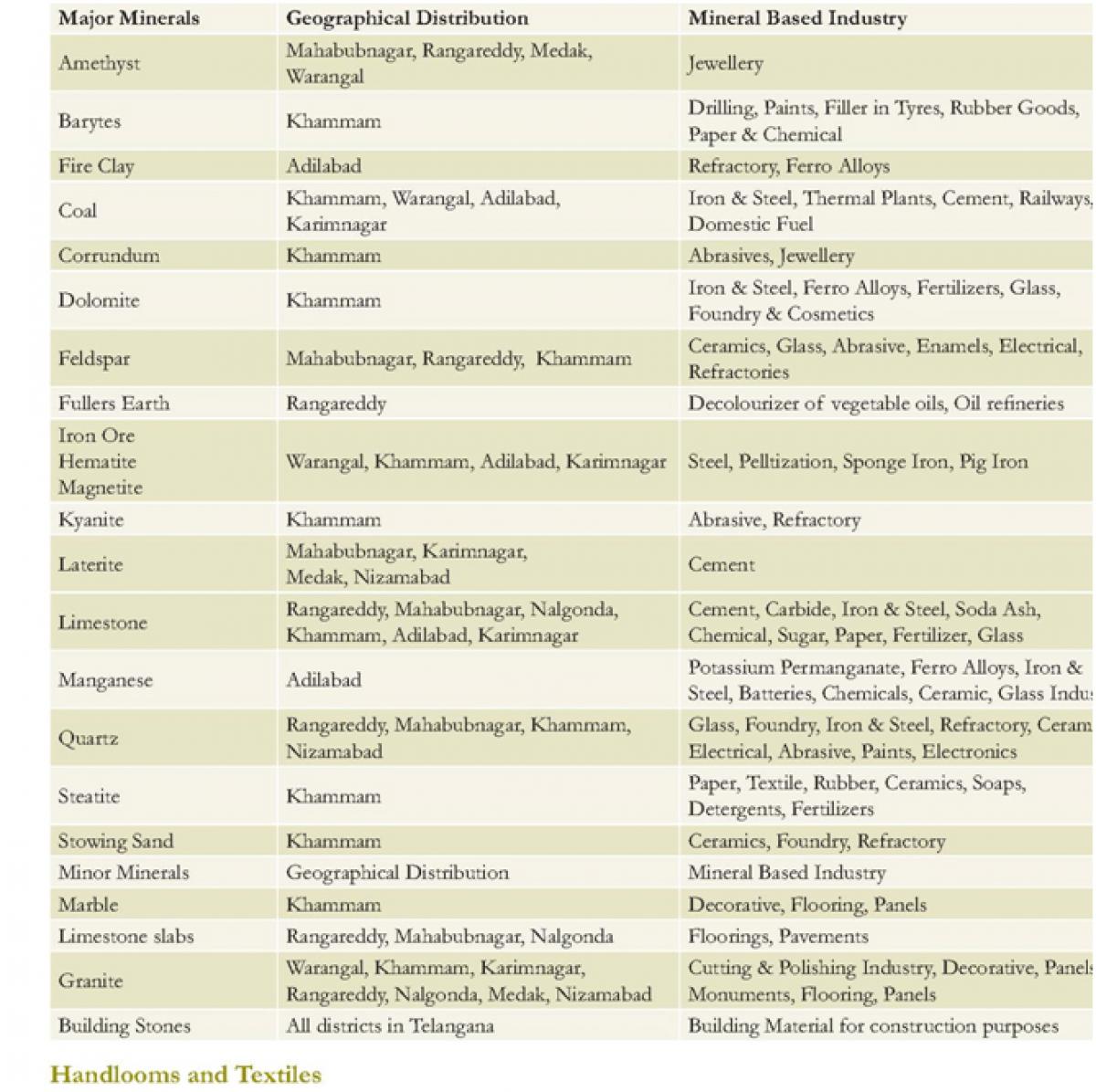 Both Public and Private Sectors established large and medium scale mineral based industries for manufacture of Cement, Steel, Sponge Iron, Ferro-alloys, Glass, Ceramics, Refractory’s, Chemicals, Granite, Marble and Limestone cutting and polishing units, Slate cutting units, Gem Cutting and faceting units, Granite monuments manufacturing units, Pulverizing units, stone crushers, Mosaic and Ceramic tile units, Lime Kilns and Manufactured sand units in Telangana State.