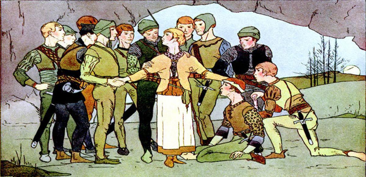 At last Benjamin said, "Dear sister, we have made a vow that the first young maiden we meet should die, because through a maiden we have lost our kingly rights." "I would willingly die," she said, "if by so doing I could restore my brothers to their rightful possessions." "No, you shall not die," he replied. "Hide yourself behind this tub until our eleven brothers come home; then I will make an agreement with them."