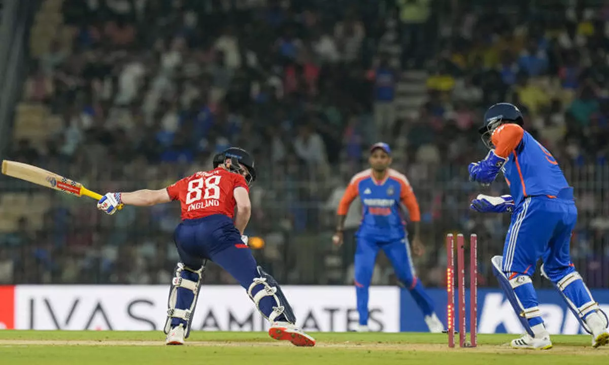 The dismissal had India at a slightly shaky 15 for one which soon turned into a more concerning 19 for two along with the wicket of Samson. The nerves were eased when skipper Suryakumar Yadav and Tilak added 39 quick runs for the third wicket to take their side to 58, but the former dragged Carse on to his stumps to give England an open-ing. From 58 for three, the English pacers crashed through that creek to bag the wickets of Dhruv Jurel and Hardik Pandya to reduce India to 78 for five. But Washington Sundar, who was dropped on 10 by Adil Rashid at mid-on off Wood, cashed in on that reprieve, hammering the Durham man for a six and two fours in succession to bring down the mount-ing asking rate.