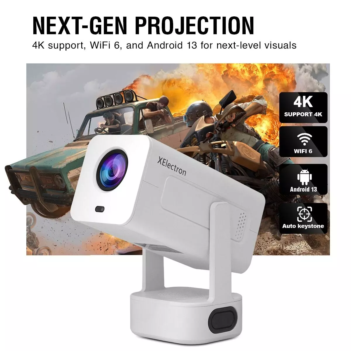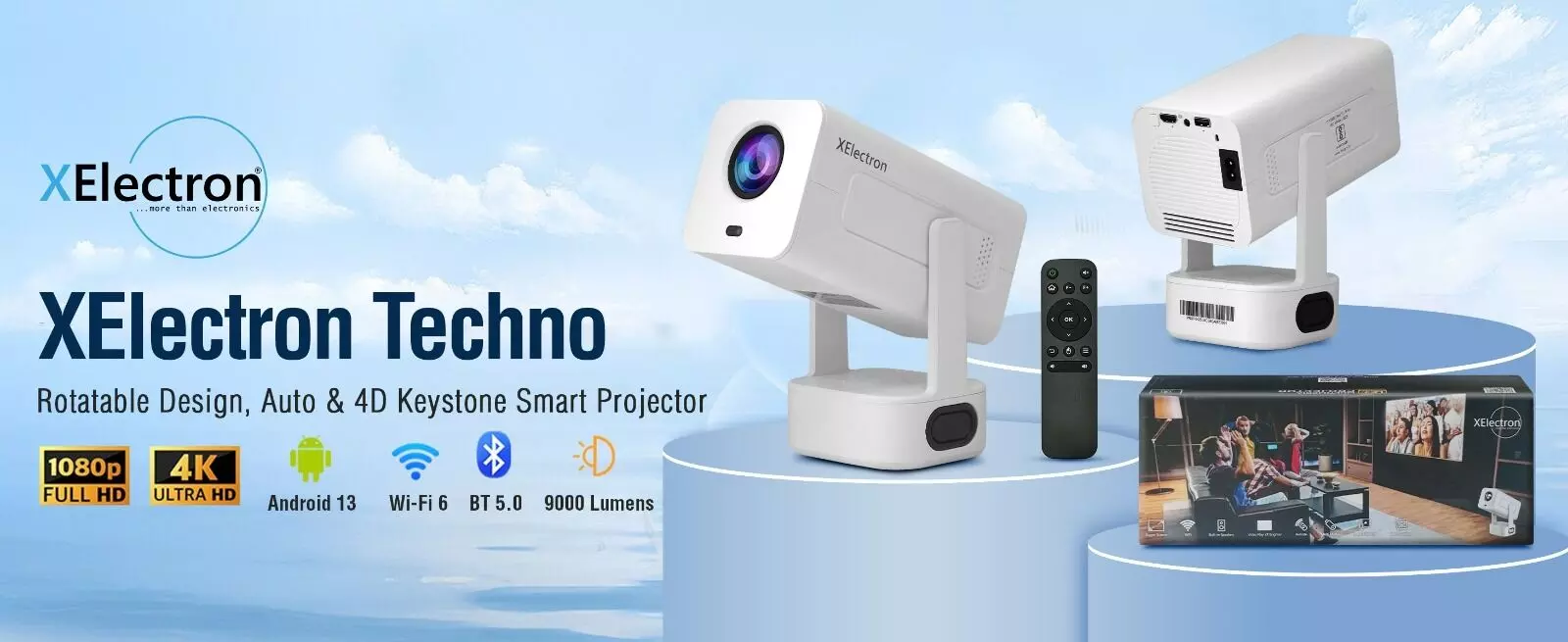 Made for a premium cinematic experience, the XElectron Techno Plus Smart Projector takes performance a step further with Full HD (1920 X 1080p) resolution and 4K decoding. Its 9000 lumens brightness and 5000:1 contrast ratio create sharp, life-like images on screen up to 150 inches. Powered by Android 13 with 1GB RAM with 8GB internal storage, it offers quick access to streaming applications, along with 2.5G and 5G Wi-Fi connectivity, for faster, lag-free viewing.
