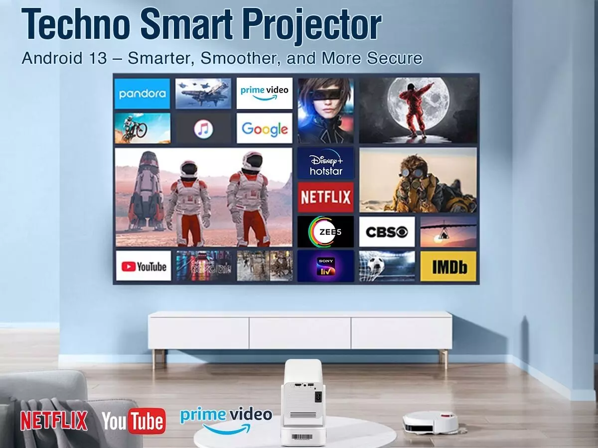 Techno Smart Projector: Native HD (1280x720p) resolution, Android 13.0 with Amlogic T950S Quad-core processor, Auto Keystone, 1GB RAM, 8GB internal memory, Dual-band Wi-Fi (2.4G + 5G), Bluetooth V5.0, Up to 150” projection size with 3.6 meters projection distance, built-in 20W Speaker.