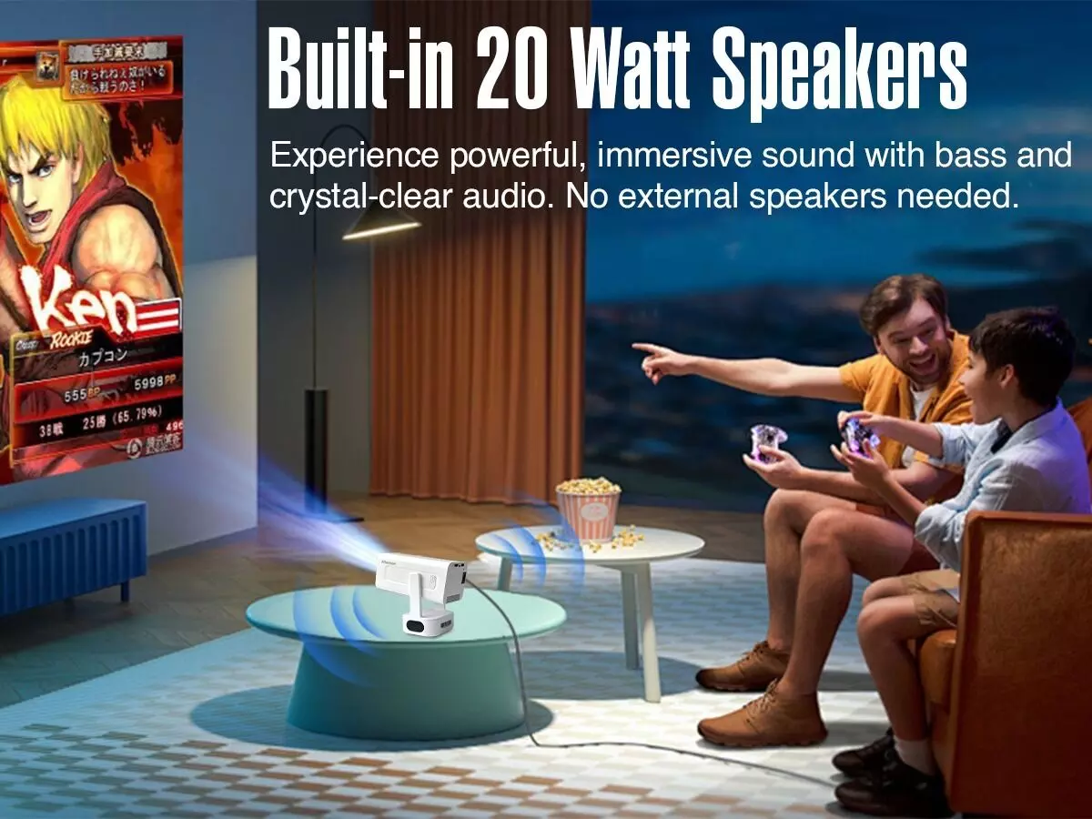 Equipped with 1 GB RAM, 8GB storage, dual band Wi-Fi (2.4G + 5G), and Bluetooth 5.0, the projector ensures smooth connectivity and seamless streaming. A built-in 20W Bluetooth speaker delivers crisp audio, and additional ports including HDMI, USB, 3.5mm audio out and AC input enhance flexibility. Its 210-degree rotation, compact design, and up to 150 inch projection size (from a distance of up to 3.6 meters), makes it ideal for homes, small offices, and casual outdoor setups without requiring fixed installation.
