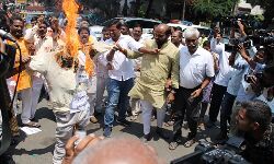 BJP leaders and workers burn the effigy of CM KCR in protest against the arrest of TS BJP chief Bandi Sanjay Kumar and demanding his immediate release in Nampally on Wednesday.