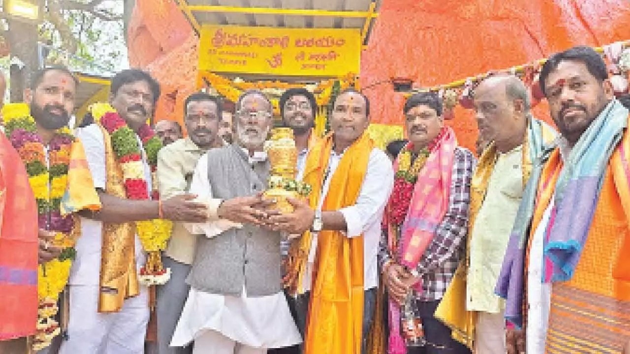 Hyderabad: The historic and famous Sri Lal Darwaja Simhavahini Temple, under the auspices of the Sri Mahankali Temple Committee, presented a Bangaru Bonam, silk clothes and vodi biyyam to the historical Golkonda Jagadamba Ammavaru on Friday.