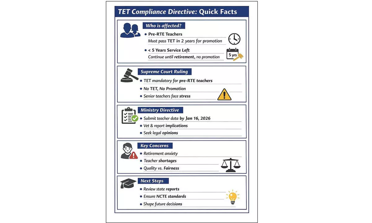 The ruling, reiterated by the Court in November 2025, has triggered widespread concern among teachers’ associations, Members of Parliament, and individual educators. Many have argued that requiring senior teachers at the twilight of their careers to qualify for TET is emotionally distressing and could jeopardise their financial security. Stakeholders also fear that the compulsory retirement of experienced teachers may create a vacuum in the education system.