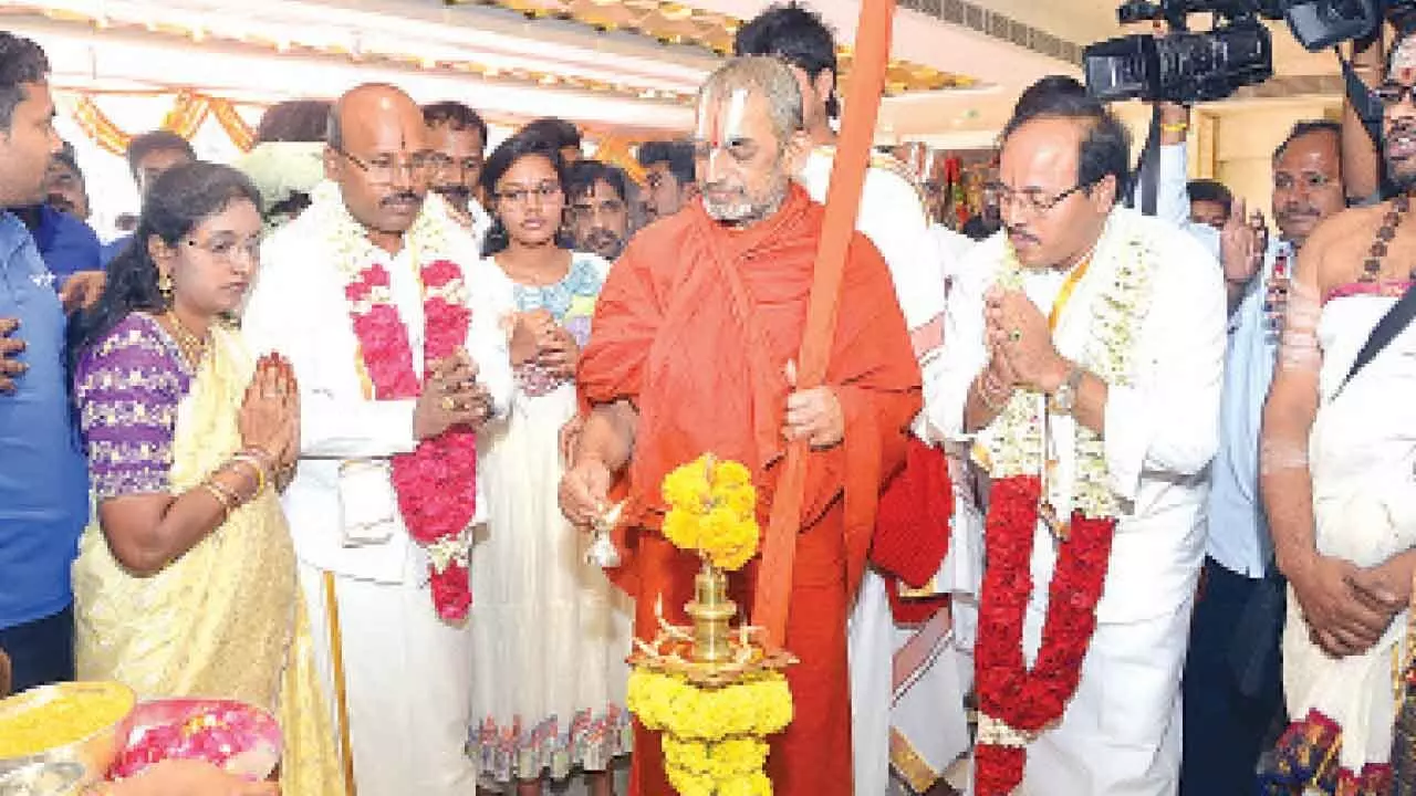 Hyderabad: Sri Sri Sri Tridandi Chinna Srimannarayana Ramanuja Jiyar Swami visited the new showroom of Vysyaraju Jewellers at Dilsukhnagar and participated in the Jyoti Prajwalana and puja ceremony. The event commenced with traditional Vedic rituals, creating a spiritually vibrant atmosphere.