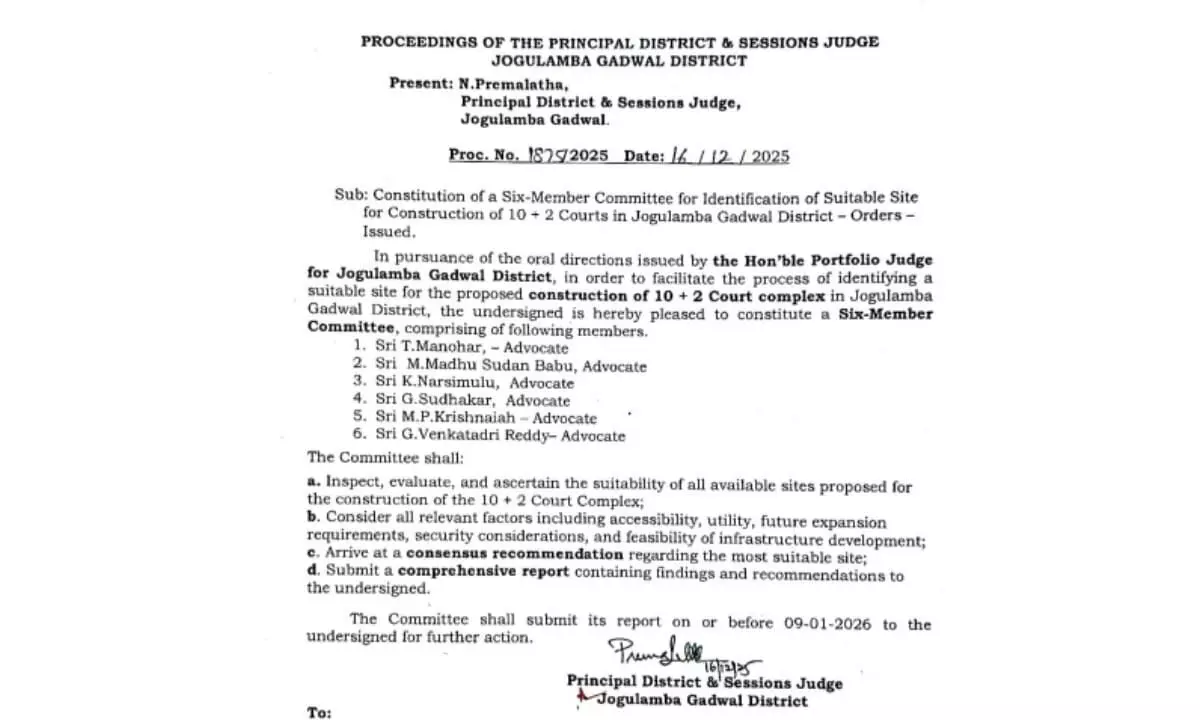 Taking these sustained efforts into account, the Principal District Judge, Smt. N. Premalatha, issued a circular on Wednesday announcing the formation of a committee comprising senior advocates to examine and recommend a suitable site. The committee has been tasked with identifying land appropriate for the construction of 10 + 2 courts in Jogulamba Gadwal district.