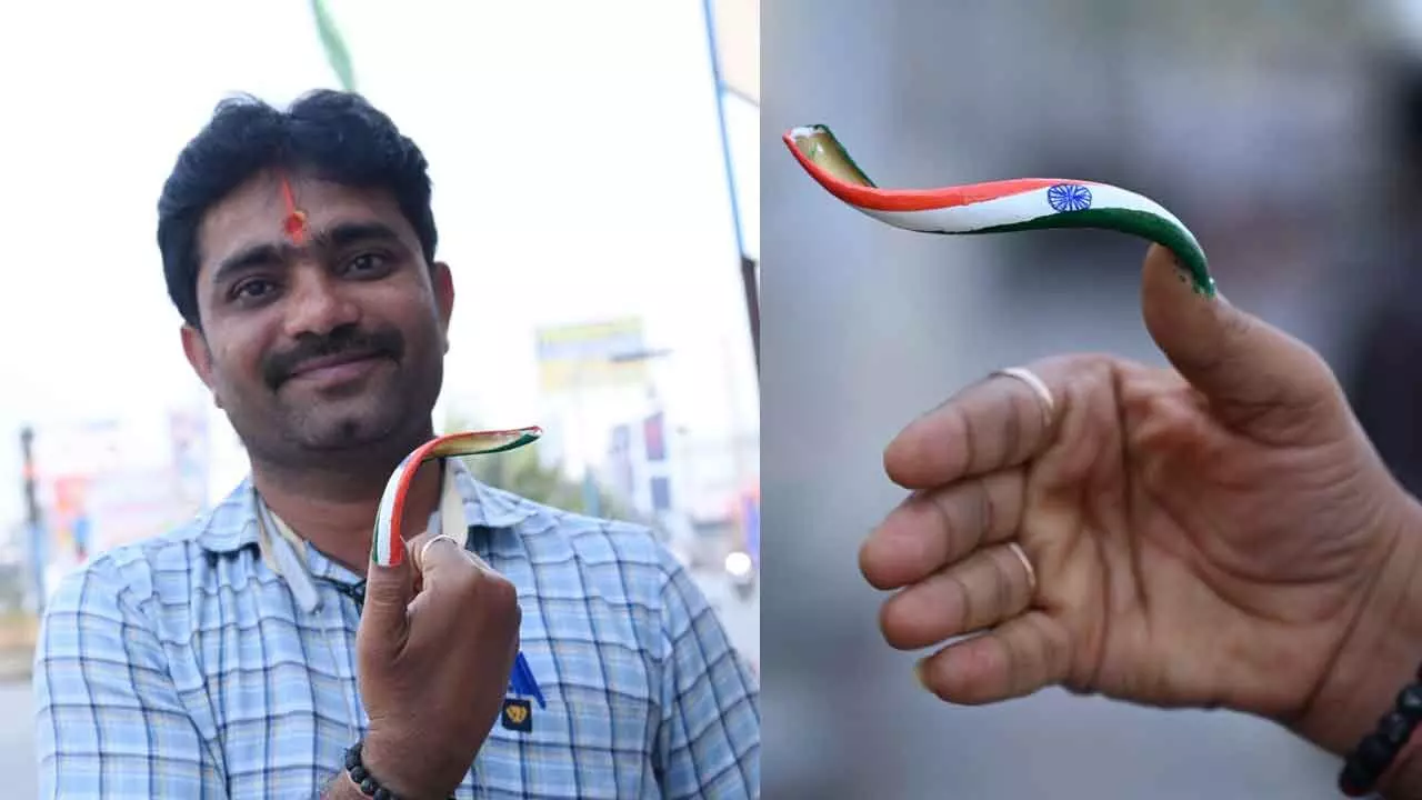 Nalgonda: Karingu Janayya Goud, a resident of Budamarlapalli village in Kanagal mandal, painted the national flag on his right thumb's fingernail, measuring 12 centimeters in length and 1.8 centimeters in width, to commemorate Republic Day.