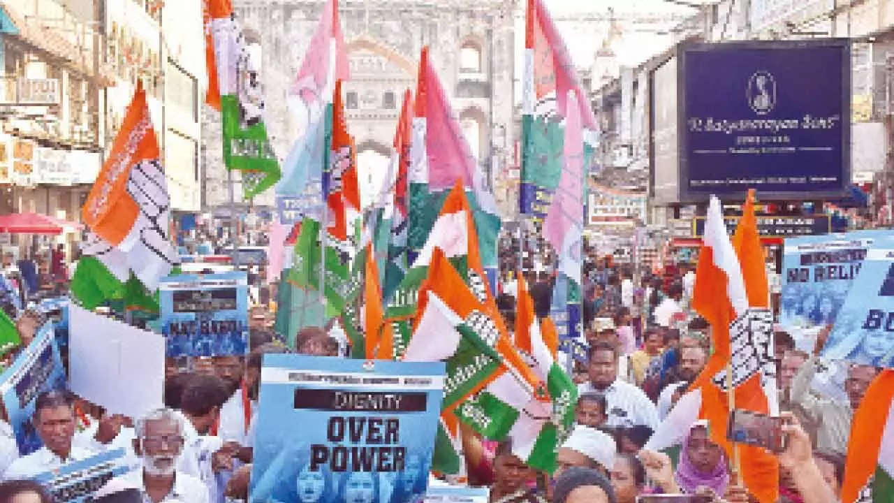 Hyderabad: Demanding an immediate public apology and resignation of Bihar Chief Minister Nitish Kumar for pulling hijab of Muslim doctor at an event, hundreds of Congress activists led by Hyderabad District Congress Committee president Syed Khalid Saifullah staged a massive protest near the historic Charminar on Saturday.